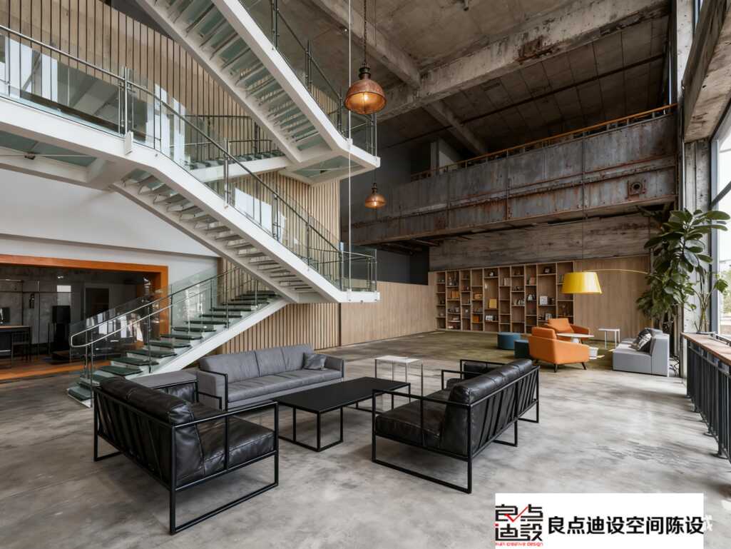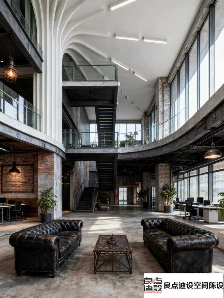 🔥 1. 软装C位搭配:金属+皮革+木纹YYDS! * 金属元素: 别只盯着水管灯!* 皮质沙发/单椅: 休息区、老板椅安排上!棕色、墨绿皮质是工业风的灵魂伴侣,一摆进去,复古摩登那味儿就有了!磨砂皮更显高级。 * 温润木纹中和: 工业风太硬?原木色桌面、开放木格书架了解一下!浅木色能瞬间注入自然暖意,平衡水泥灰的清冷感。 选有做旧纹理的,别整太光滑!