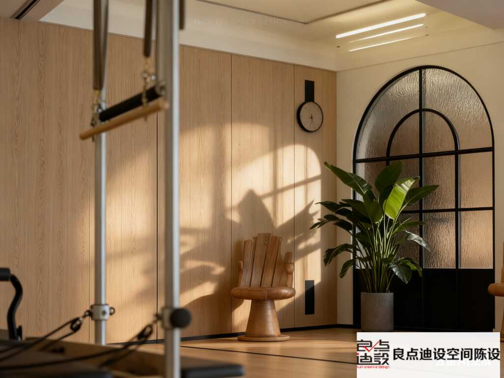 ✔️ 隐形收纳系统:定制原木器械柜嵌入墙体,折叠瑜伽垫、弹力带统统隐身