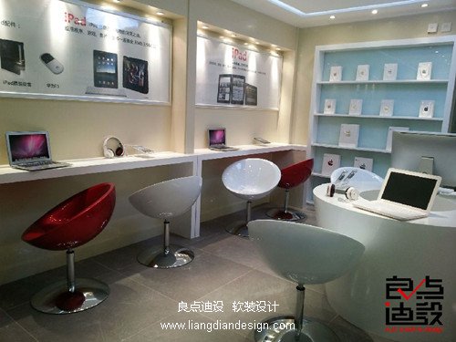 本Apple专营店背景色是地面的灰色和墙面的白色,配以原木色和亮银色家具,点缀上高贵的具有科技感的炫色个性座椅,整个空间色彩搭配明快高调,凸显Apple高级、尊贵与时尚。