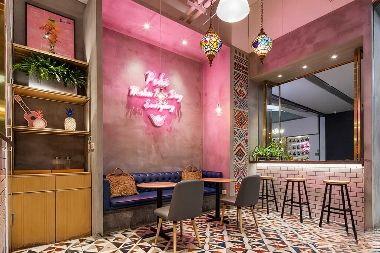 家人们,你们有没有遇到过那种一走进去就忍不住掏手机的餐厅?今天咱就来扒一扒这家凭软装直接封神的网红店!说真的,光是那面墙就够你拍九宫格了——红橙黄绿蓝的彩旗串成一排,上面印着“SALMON”“ALOHA”这种自带度假感的英文词,再配上热带植物图案,瞬间把你拉进夏威夷海滩模式。背景是干净到反光的白色瓷砖墙,深蓝色皮质卡座往那儿一摆,高级感直接拉满,懂的都懂这是出片神器啊!