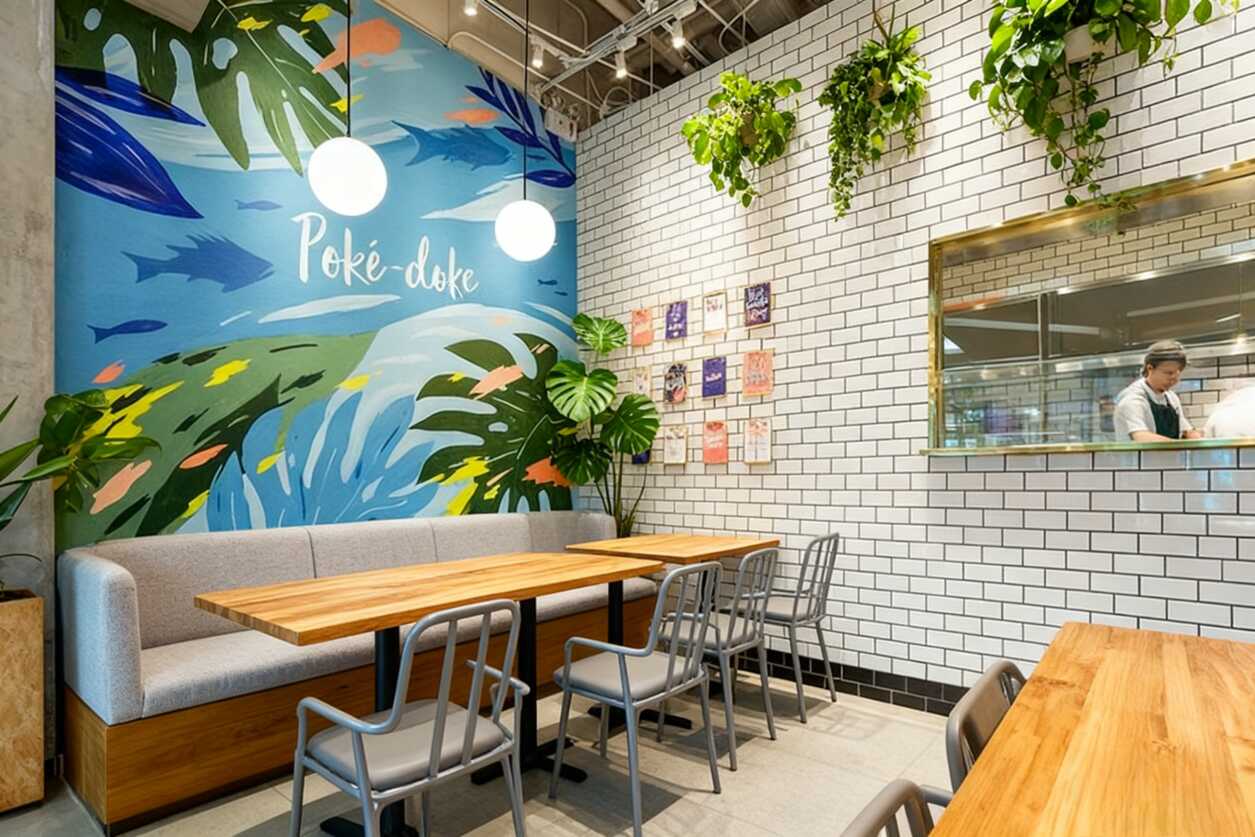 再看看细节控狂喜的文案彩蛋:墙上重复出现的“KEEP CLAM(P)”“Poke Bowl”“SHAKA”,明明就是给菜品埋梗——明摆着告诉你这是家玩转夏威夷波奇碗的专门店嘛!连“AI生成”“为人类服务”这种调皮slogan都敢塞进装饰里,老板的脑洞我服了。