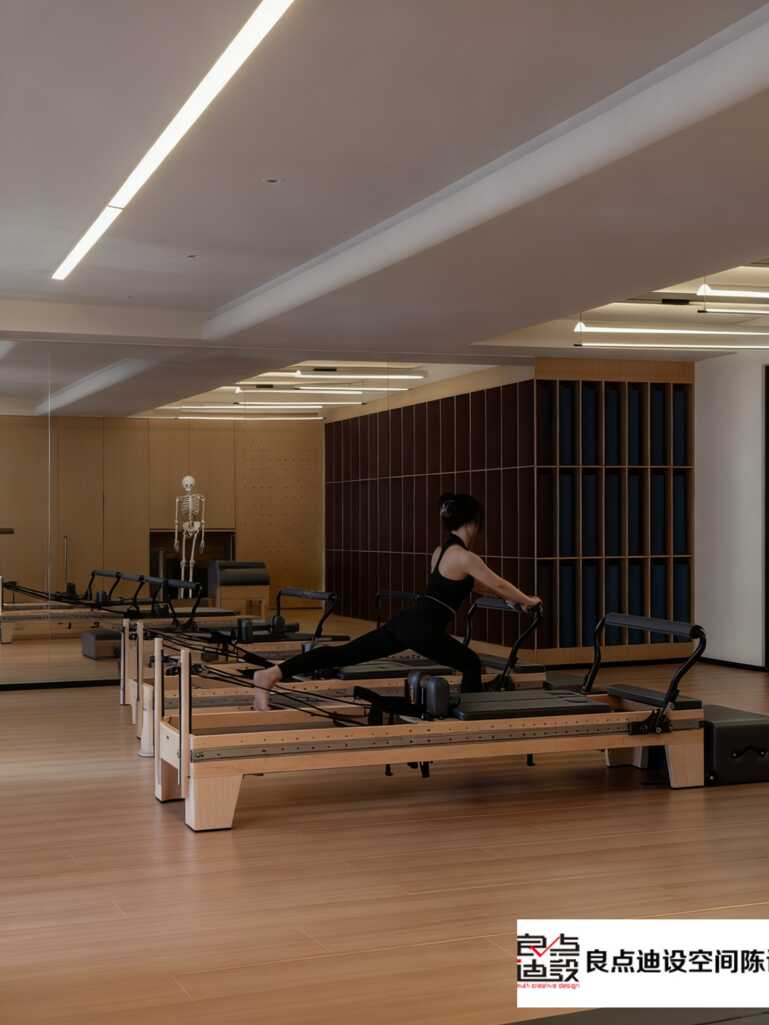查了资料发现是「旺财28空间陈设」的作品,果然高手!能把“专业教学需求”和“空间美感”平衡得这么好。既保留了普拉提室必备的功能配置,又通过材质对比和灯光设计,营造出高级松弛的氛围。
