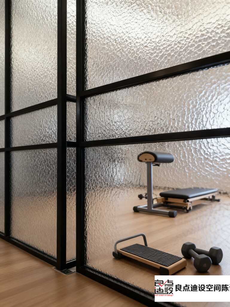 整面墙的超大玻璃直接引光入室,自然光柔柔洒在器械上,练核心的时候连影子都自带滤镜✨ 两侧磨砂隔断若隐若现,隐私和通透感双双拿捏,这设计我真的服!