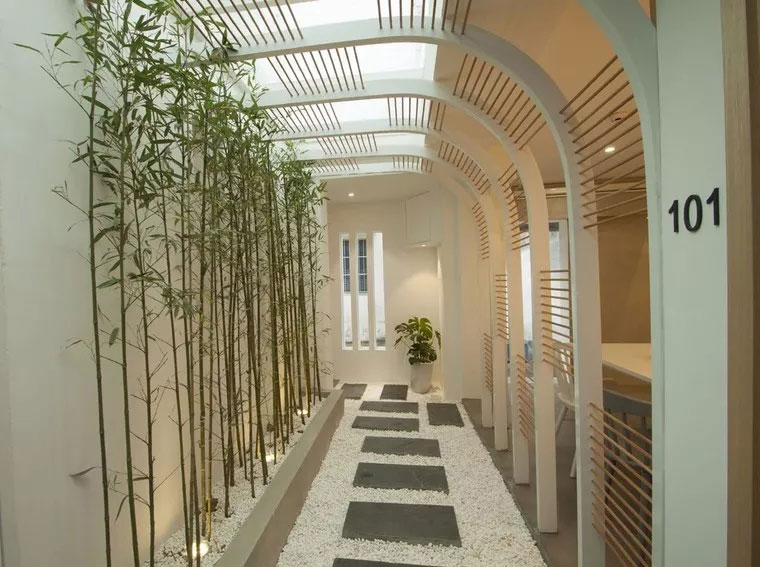 对于走廊的地面,采用白色的鹅卵石与石阶拼接,再再两端加上提示灯,让人有种在室外漫步的感觉。