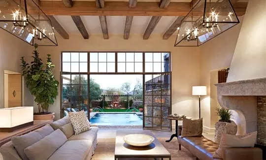 对于民宿客厅软装设计,将天花板与落地窗结合,不仅能将民宿客厅空间采光率提升,而且使整个空间更加明亮大气,更是将室外的景色净收眼底。