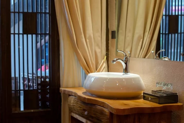 打开客房,房间不小,半面墙大小的木格窗子保证了采光和通透度。原木的家具,质感很好,古雅稚拙。这里的摆设不像酒店那样程式化。床品干净,枕头靠垫非常大,软硬刚好,喜欢。坐在床上试试,非常软,但又没有陷进去的感觉,满意。房里有地暖,不像空调的热风那样简单粗暴,而是如沐春风的感觉。需要提前2小时打开,如果人在外面,可以打电话请客栈员工帮你提前开地暖,回来时屋里温温的正好,不会有燥热感,对我这种怕冷的人来说,惊喜。毕竟雨季的丽江早晚还是很凉的。浴室地板干净,没有异味,洗澡的喷头很大,热水几秒钟就出来了。我头发很长很费水,洗澡用了50分钟水温依然给力,而且水温稳定,不会忽冷忽热,暖心。家具简洁无虚饰,木质书桌椅实用舒服,电水壶、茶杯、电视、wifi等等一应俱全,液晶电视信号好,频道多。该有的都有了。丽江客栈的通病——隔音差,我也没发觉,后来才知道,隐逸东方的外观是纳西风格的木房子,但墙壁和地板做了隔音处理。