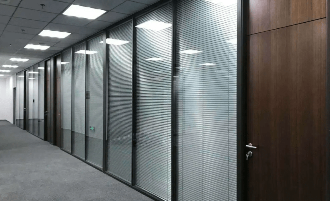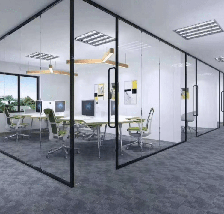 在办公室中,玻璃隔断可以作为隔断墙,将不同功能区域进行分隔,如会议室、接待室、办公区等。玻璃隔断的透明度高,可以让员工在不同区域之间保持视线的联系,提高团队协作和沟通效率。