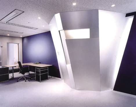 上面组图显示了某公司的办公空间设计。其平面布局方案是按照典型的功能关系进行分区和布局。大门接待区与公共办公区相连,管理办公室在公共办公区边缘,会议室和工艺设备间独立围合。所有工作顺序都应建立在空间划分的基础上。由于室内空间的净高较低,立面也采用了一些斜面造型,通过光线和胶片的错落让使用者感受到空间的压迫感。