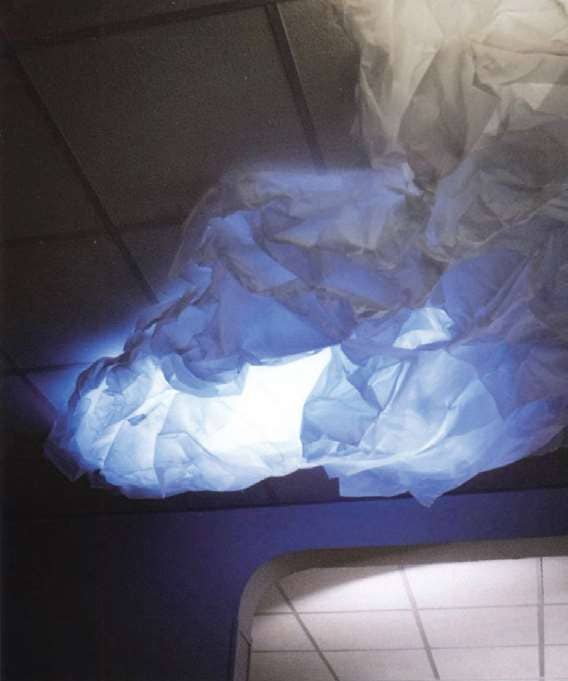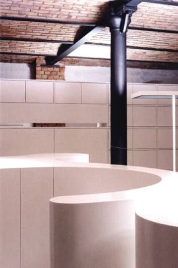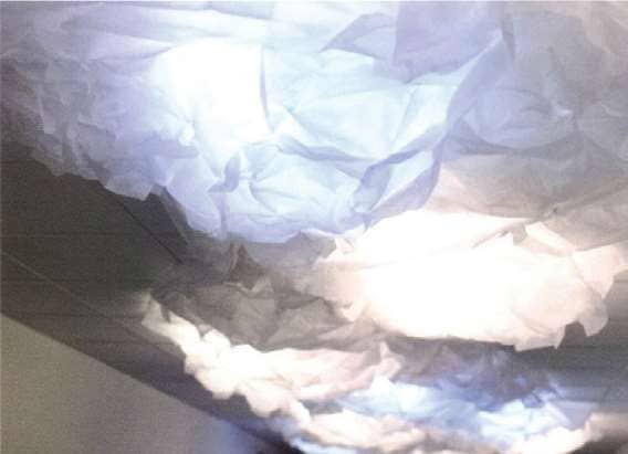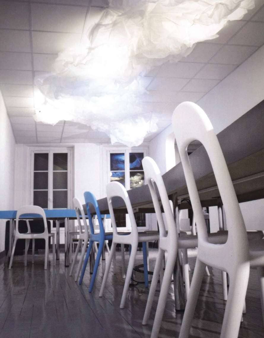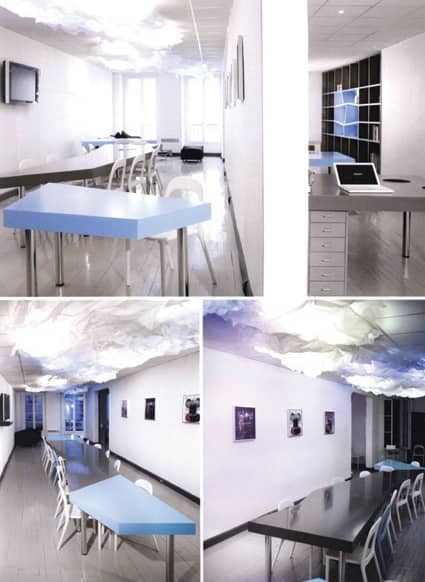 上面组图所示为纸片云广告公司办公室设计。整个办公空间狭小,装修投入不多。更重要的是,空间必须满足员工创造性思维工作所需的宽松环境氛围。这一设计采用了“云”的概念,隐喻了思维在云端行走的人文思想,引发了用户的空间联想,解决了之前的一系列空间问题。
