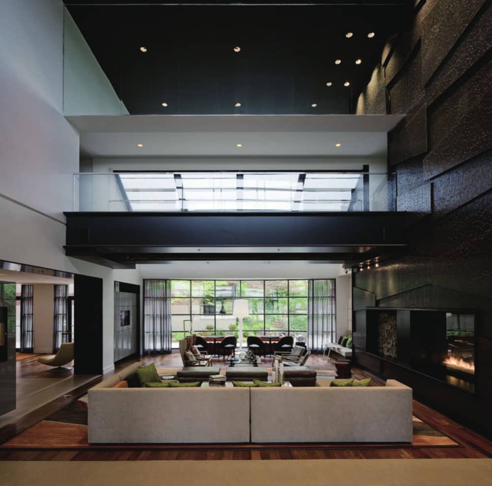 宏伟大厅的中心区域有壁炉地板和独特的玻璃雕塑。不同的区域从建筑的中心向外延伸,以满足个人和团体的工作和休闲需求。玻璃晶莹剔透,从其他角度诠释了石头的沉稳,打造出一面有层次感的反光墙。所有的材料都忠实地展现了它们的属性,钢、玻璃、木材相得益彰,重新定义了现代主义的传统。