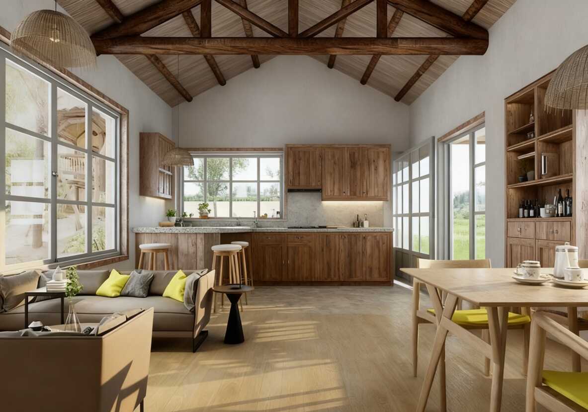 (虽然效果图没拍室内,但根据经验盲猜!)这种庭院风格的民宿,室内软装一定要**“延续户外的松弛感”**——比如用棉麻材质的窗帘(和百叶窗搭配,透光不透人)、原木色的家具(和户外廊架呼应)、墙上挂几幅手绘的植物插画,甚至在角落放个藤编筐装杂志,客人一进门就会觉得“哇,和院子是一套的!”