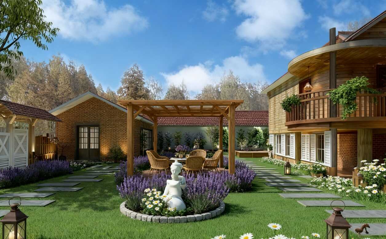 先看这院子!谁能拒绝一推开民宿门,就撞进一片紫色海洋啊~ 这个案例里的薰衣草花境(搭配小白菊做点缀)真的绝,既解决了“草坪太空旷”的问题,又自带“法式乡村”的氛围感。重点是选植物别只看颜值,像薰衣草这种多年生、好打理的品种,民宿主完全不用天天操心浇水施肥~