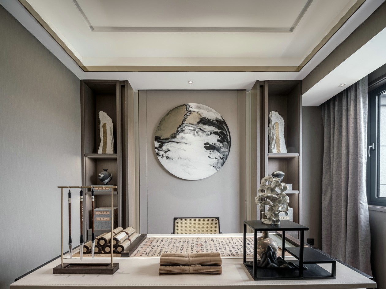 新中式软装风格的家居选材以自然质朴的木质为主,并融入大理石、皮质、金属等现代材质,让新中式焕发出时尚低奢的都市风采。