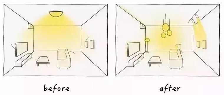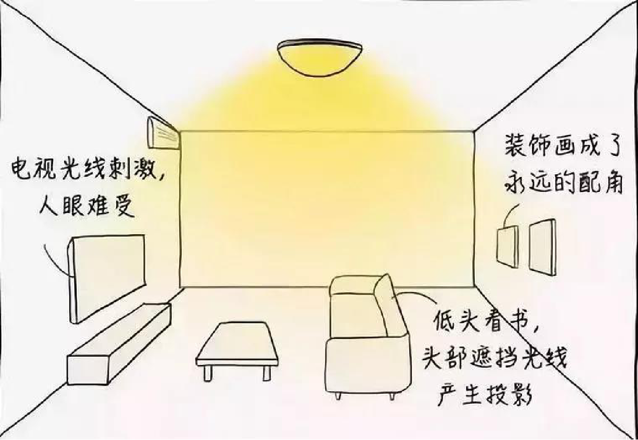 我拿客厅给大家做一个例子。像之前的客厅空间,他是以一盏吸顶灯去作为整个空间的照明。没有其他灯光,如果我们坐在沙发上面看一些杂志啊,或者是看手机啊,等等。这样子的一个情况。头部可能会形成一个遮挡,然后产生一个阴影,所以我们在这个区域去做一些阅读之类是不舒适的。如果有阅读需求,我们可以增加一个光线柔和的落地灯。同时,一个高颜值的落地灯也是提升家庭整个空间格调的一个装饰物。或者电视墙这一块儿去增加一些辅助性光源。这样子的话能够让我们看电视的时候更加放松,因为减少了电视画面和背景的一个亮度差。可以缓解我们的视觉疲劳。