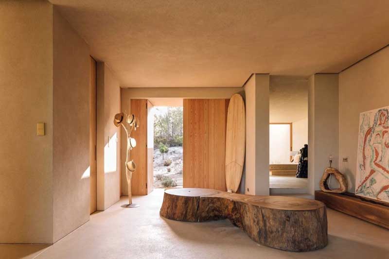 除了民宿外观设计以外,民宿室内空间也十分简约,空间中并没有采用太多的装饰品,而是以朴素的材料和自然感极强的软装进行装饰,给人一种优雅的气质。无论是民宿空间中树枝样式的挂衣架,还是实木的矮桌椅,枝桠形状的灯具都给人一种淳朴之中而不失优雅的柑橘,让空间变得更加轻盈。