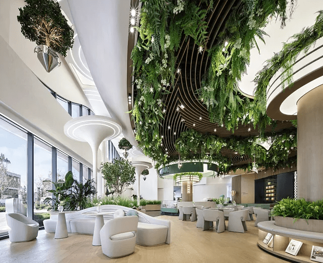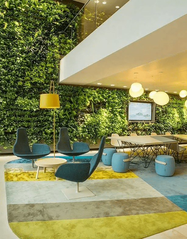 再次,注重室内植物的布置。室内植物不仅可以增加办公空间的美感,还可以改善空气质量。植物通过光合作用吸收二氧化碳,并释放出氧气,从而提高室内空气的质量。在办公空间的设计中,可以设置一些绿植,如盆栽、花卉等,使员工能够感受到大自然的气息。此外,还可以设置一些垂直绿化墙,将室内空间与室外空间连接起来,为员工提供一个舒适和健康的工作环境。