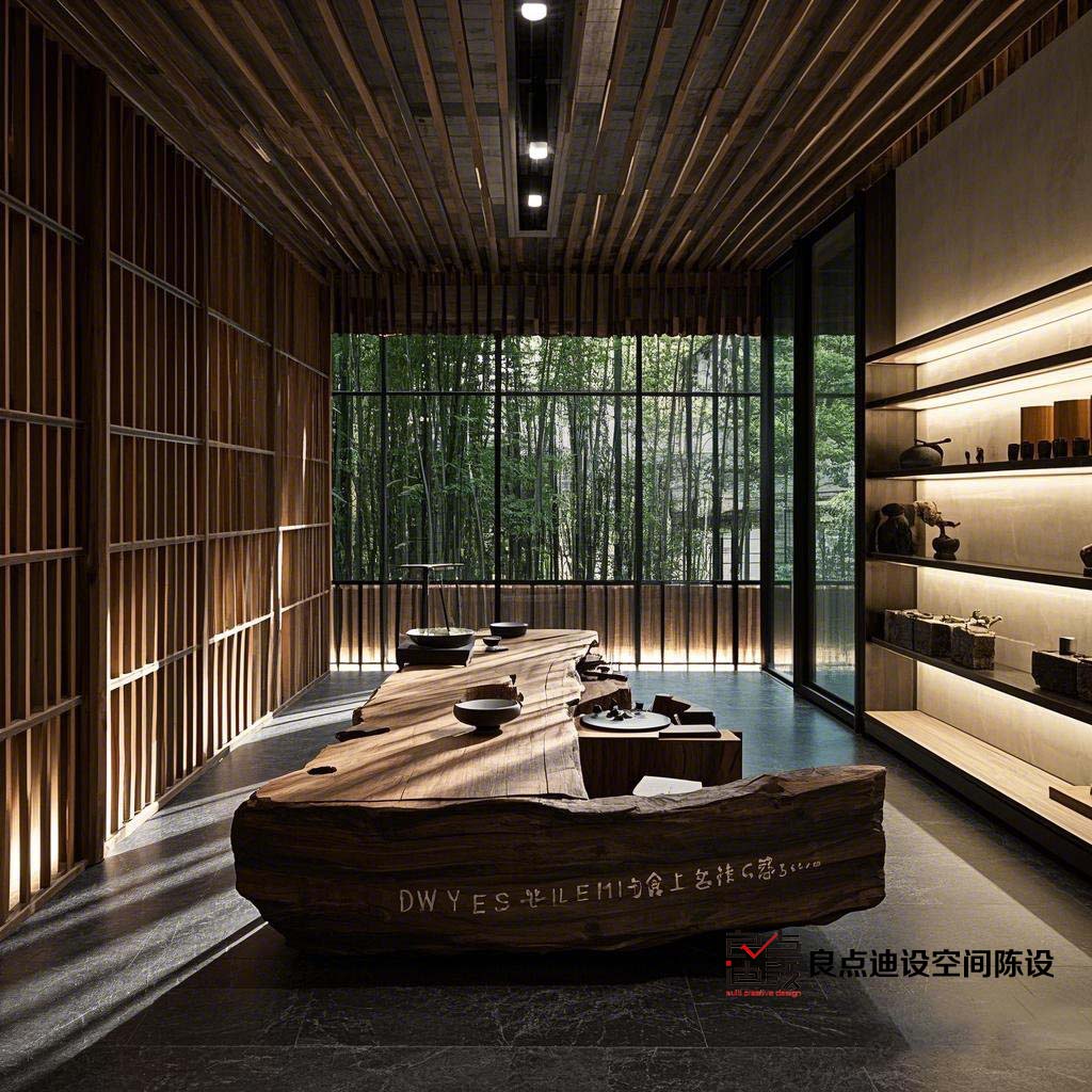 图1:阳台茶室软装效果图1,使用了竹子、藤条等天然材料,营造出自然的氛围。