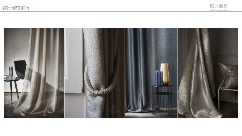 客厅窗帘的颜色***好从沙发花纹中选取,浅色调、透光性强的薄窗帘布料为好,能够营造出一种庄重简洁、大方明亮的视觉效果。