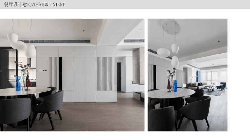 餐厅借助门厅长走廊,放置六人位的圆桌,原始布局餐厅位置稍小,所以没有收纳的区域,利用西墙增加收纳设置餐边柜,作为厨房区域收纳的补充或者当做酒柜也是极好的。