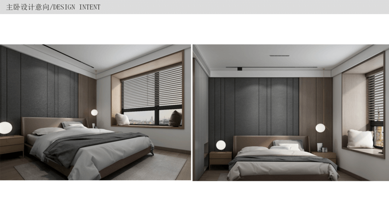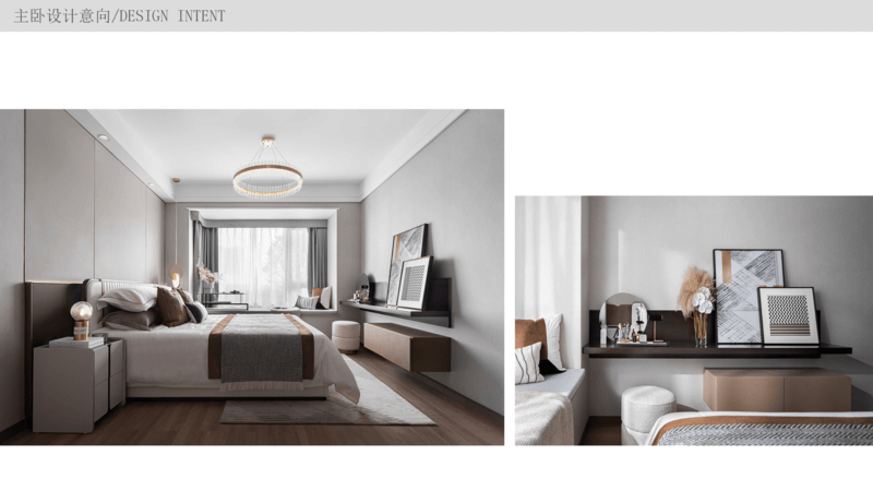 主卧 交付时带有飘窗,可以将飘窗位置利用起来,改造成一个mini的学习区,背景墙按照风格和喜好做硬包,在床尾设立斗柜和化妆台,满足女主人的日常需求,因为主卧带衣帽间,所以收纳已经足够了,主要以装饰和体验感为主。