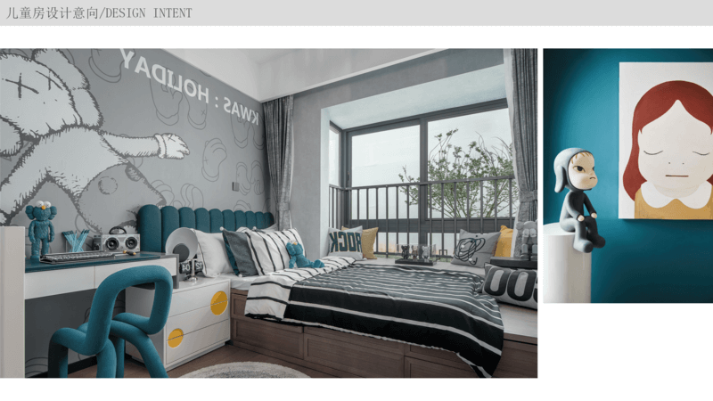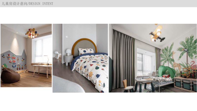 儿童房 主要以学习空间为主,用软装饰品来区分性别,如果业主孩子年纪较小也可以将这个房间当做亲子互动区,小孩子都比较爱创造,那么可以设计一面黑板墙或者积木墙用来“乱涂乱画”。