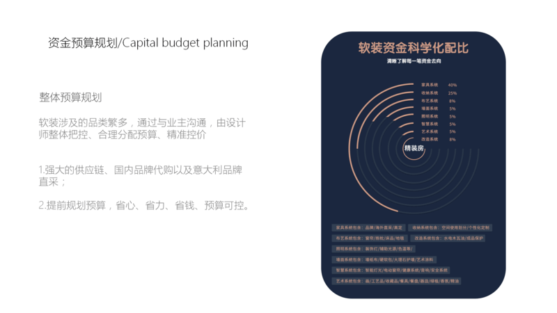 上图是大概软装设计所包括的类目和价值占比,现在精装房越来越多,而软装设计师就是是从整体上综合策划装饰装修设计方案,体现出居住者的个性品位。