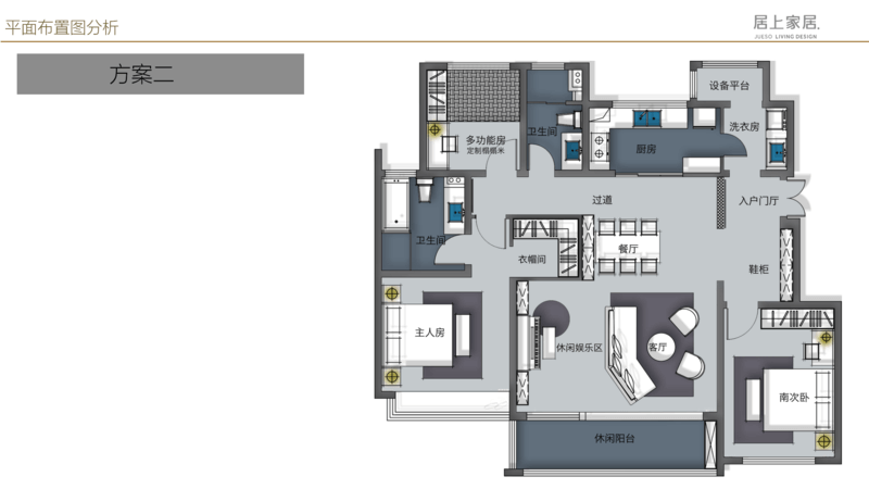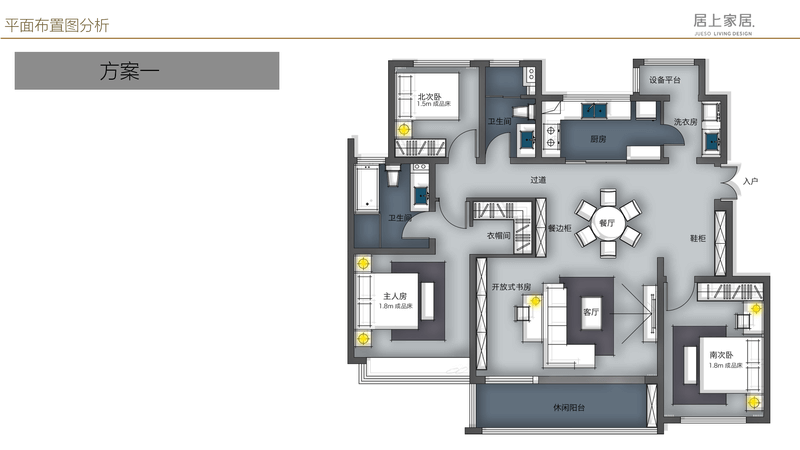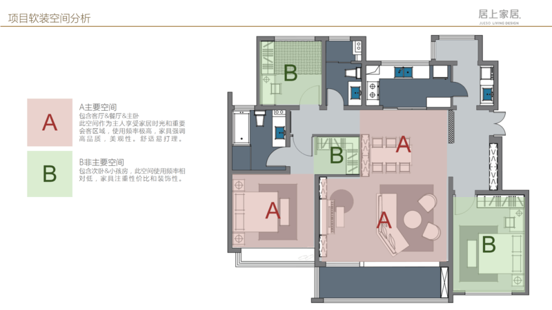 对于整体空间,一定要有主次之分(如上图),整个空间一定以客厅、门厅、餐厅,同时包括主卧作为整体空间的 主要空间,当然使用频率相对更高,家具更强调品质和美观,同时具备舒适性,便于打理。