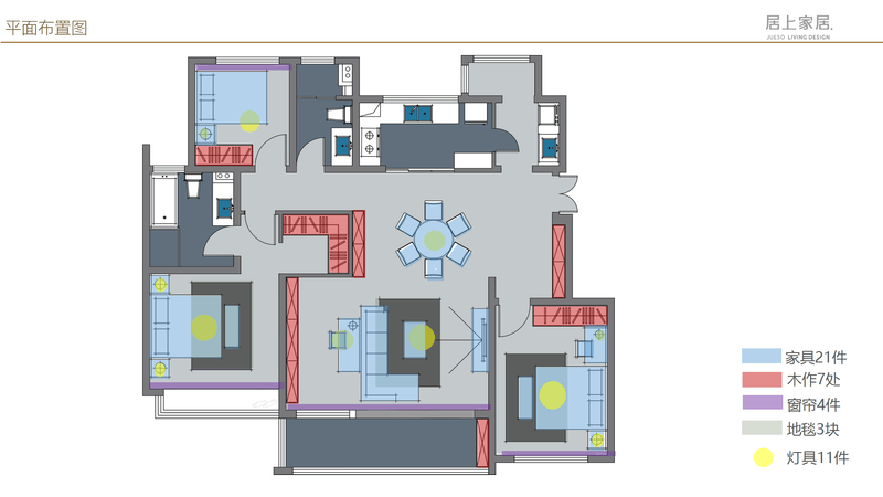 可以看出,以常规布局统筹出来家具、整体定制柜、窗帘、地毯、灯具等需要的数量;