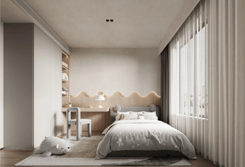 儿童房的设计,除了要营造一种天真烂漫的氛围外,还需要有休憩功能、学习功能和收纳功能;采用一体化的定制形式,将衣柜、书柜、书桌做一体化定制,***大化利用空间的同时,满足多重需求。