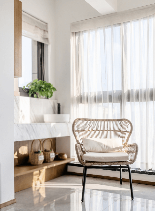 北阳台作休闲使用。绿植、休闲椅、小茶几构建了一个小而精致的休闲角,是家中难得的放松空间。如果有好友登门也可来这里小坐,两人喝喝茶、聊聊天,非常悠闲。