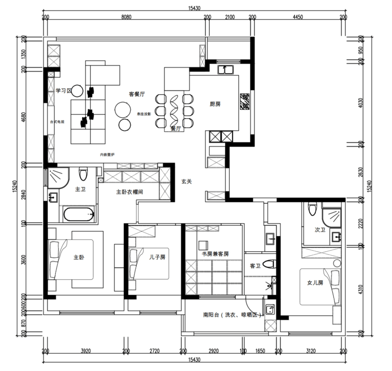 因为这个户型南北都有阳台所以南阳台主要用作洗衣晾晒,北阳台作为休闲区,种种鲜花绿植等。四个房间均朝南,保留其中三间卧室均带有飘窗,居住起来比较舒适,两间作卧室套房,一间为主卧,另一间可以作为长辈房,使用起来更加方便;儿子房靠近书房,卧室比较小,只做基础的收纳和满足睡眠需求,学习主要在书房完成,提高空间的使用频率。