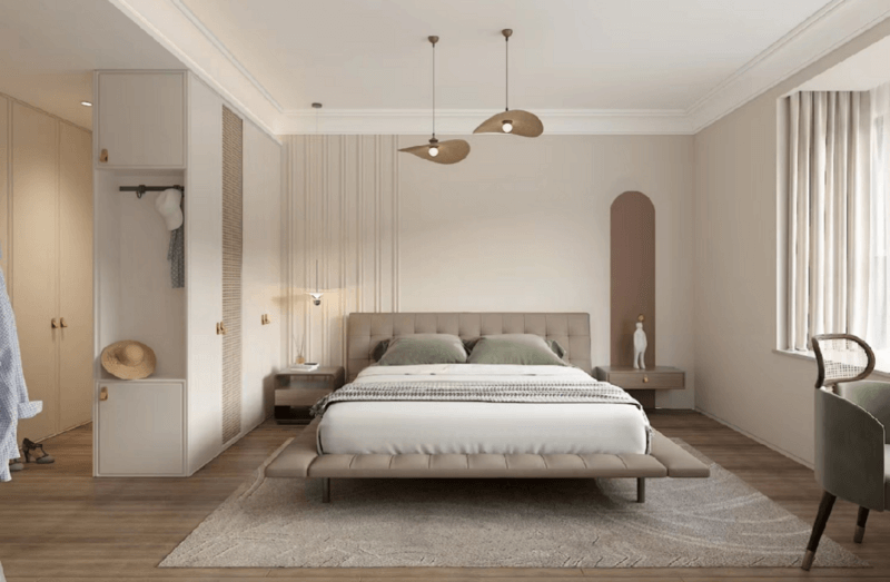 次卧相比主卧要小很多,利用床头墙面,打造收纳+书柜一体化定制床头柜。打造沉稳、淡雅、温暖的感觉, 忌过冷、艳、暗、亮。