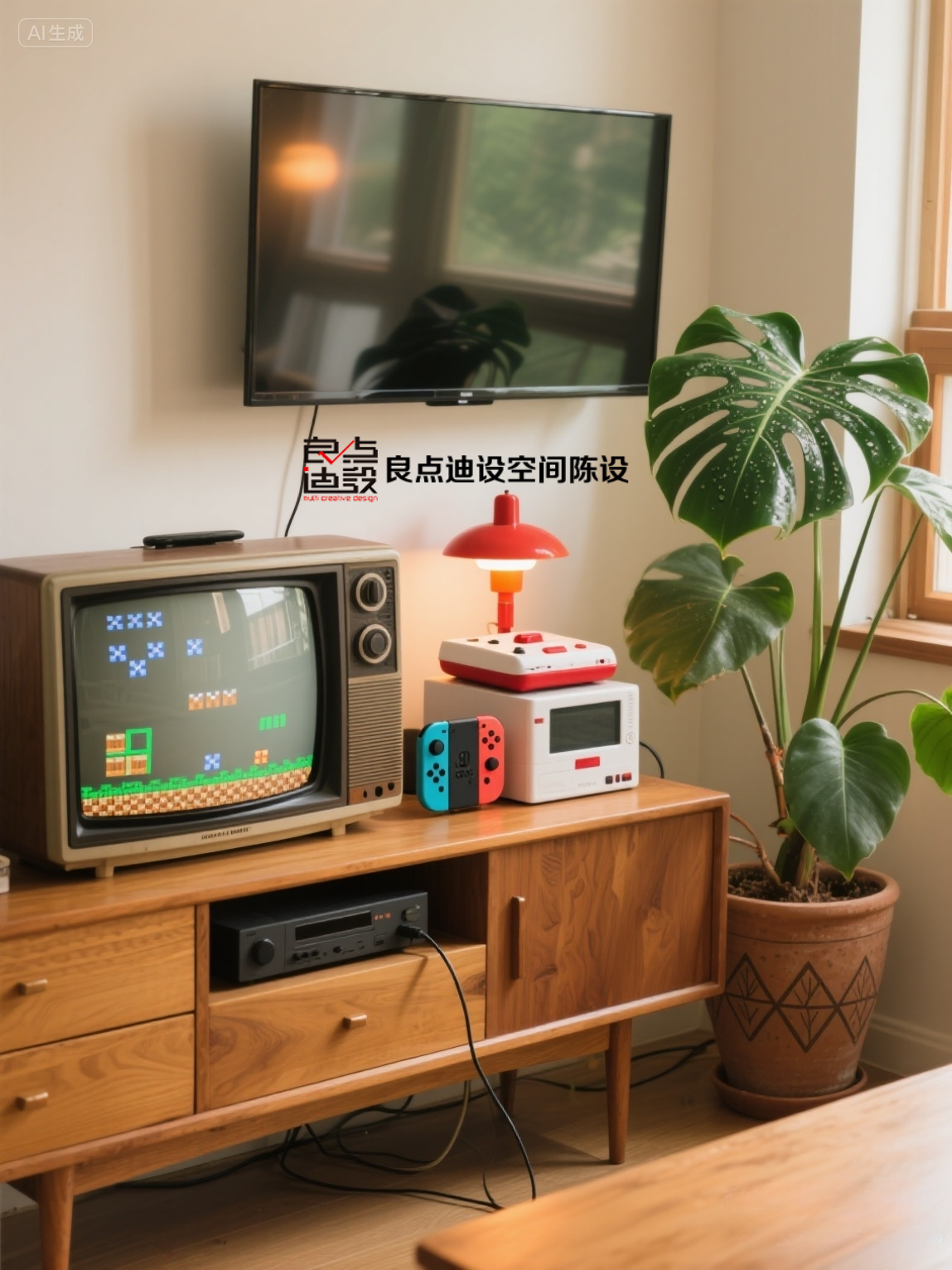 光有大件家具可不行,氛围感的关键在细节! 瞅瞅柜子上都摆了啥?一台复古小电视(正播着游戏呢,生活气十足!)、一盏红顶台灯(暖光源,氛围担当)、游戏机、小方盒… 这些小东西看似随意,其实都是精心搭配的。颜色有呼应(红顶灯是亮点),材质有对比(金属、塑料、织物),高矮错落。记住口诀:实用+好看+带点个人爱好。你喜欢的摆件、收藏,大胆摆出来,这才是你的家!