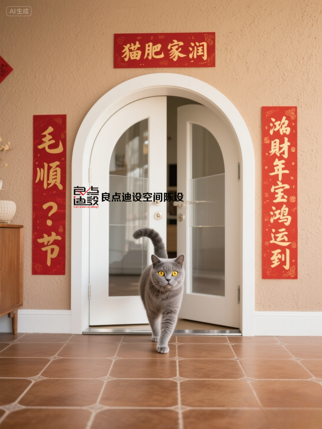 嘿家人们!今天咱们就唠唠这张吸睛的家居照——拱形白门搭上红底金字的对联,“猫肥家润”“鸿财年宝鸿运到”,喜庆得不行。地上铺着暖暖的棕色瓷砖,透着原始自然感,那只灵动小灰猫翘尾巴蹦跳出门,圆溜溜的眼睛亮闪闪的。整体画面温暖又生动,你说这不就是理想家的模样?