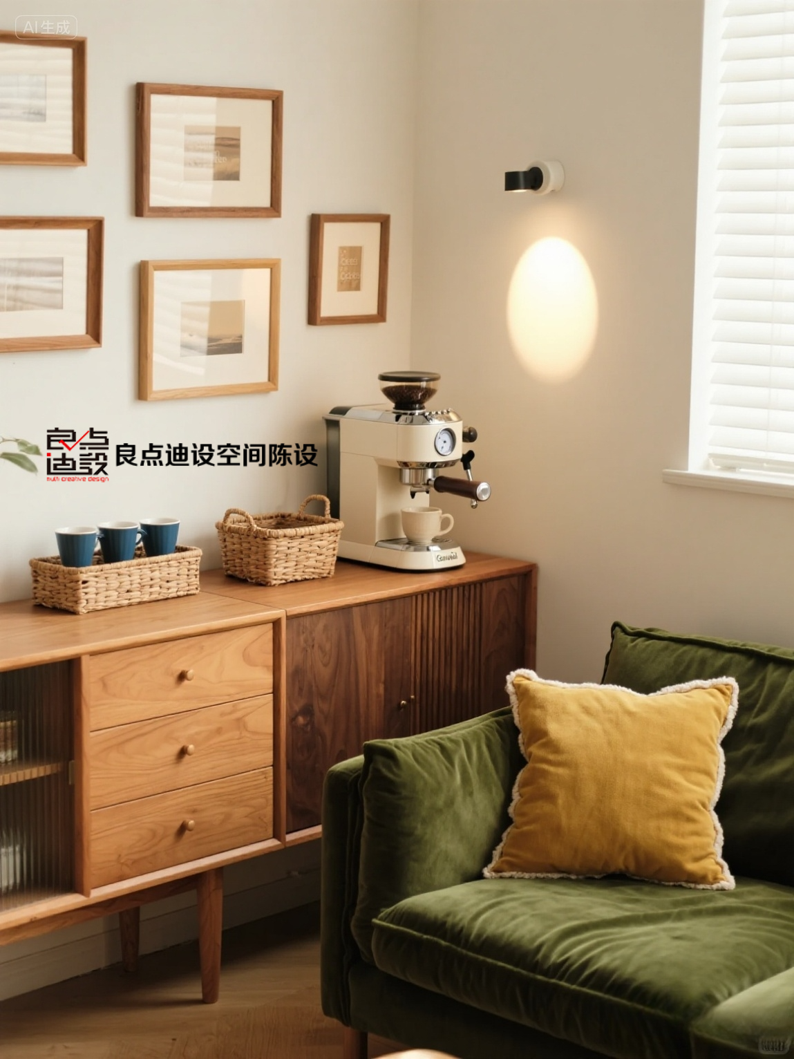 95㎡治愈系小家,原木风软装设计+绿绒沙发,咖啡角一摆全屋都香了!​_旺财28北京软装设计公司