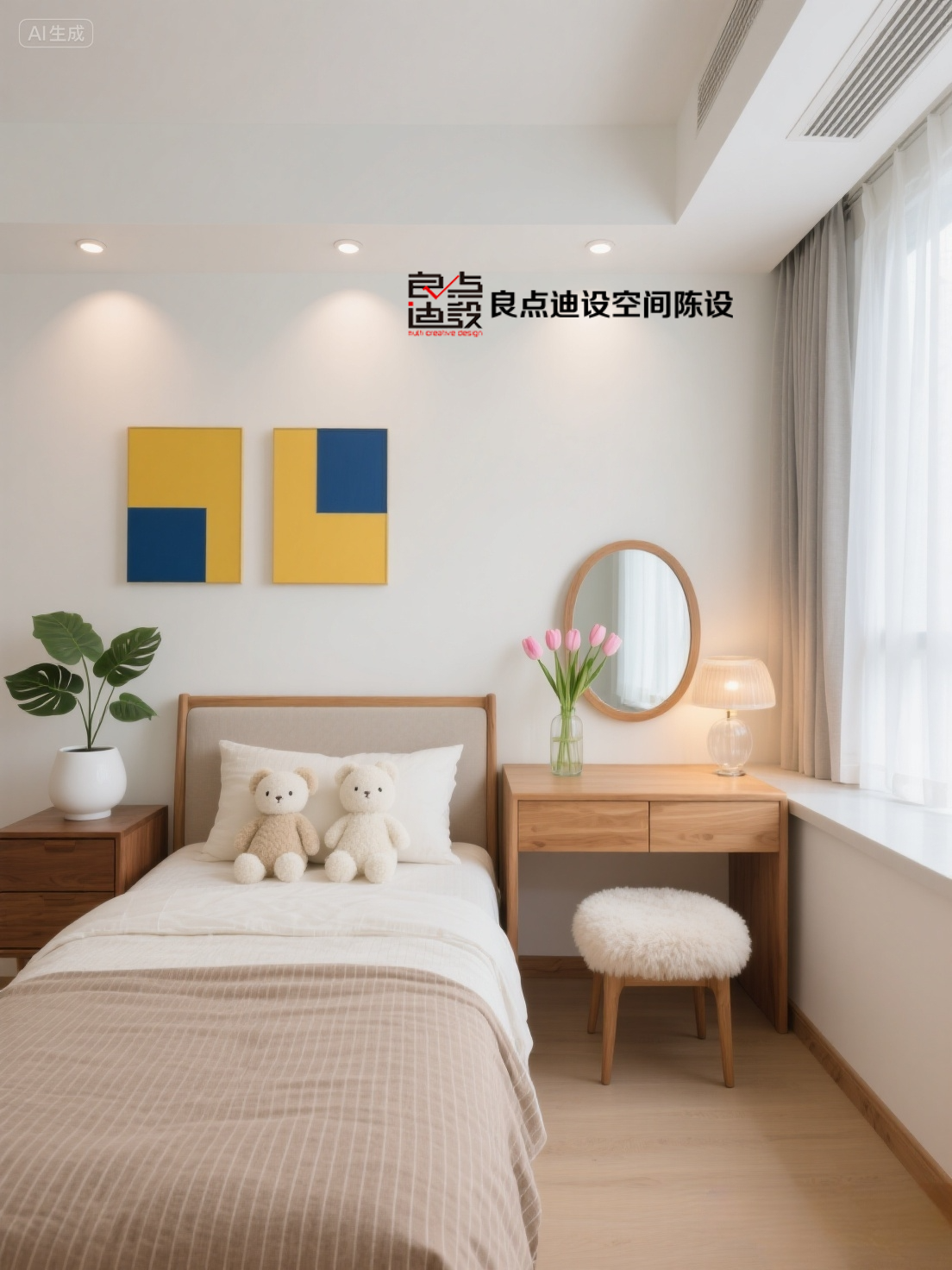 第二招:木质选浅不选深! 关键来了!衣柜、梳妆台,统统给我选浅色木纹!那种有自然节疤纹理的***有Feel。深色木头压层高,浅色才是营造温暖轻盈感的灵魂选手。衣柜的棕色小把手是点睛之笔,够小却够提气,打破单调不费力。