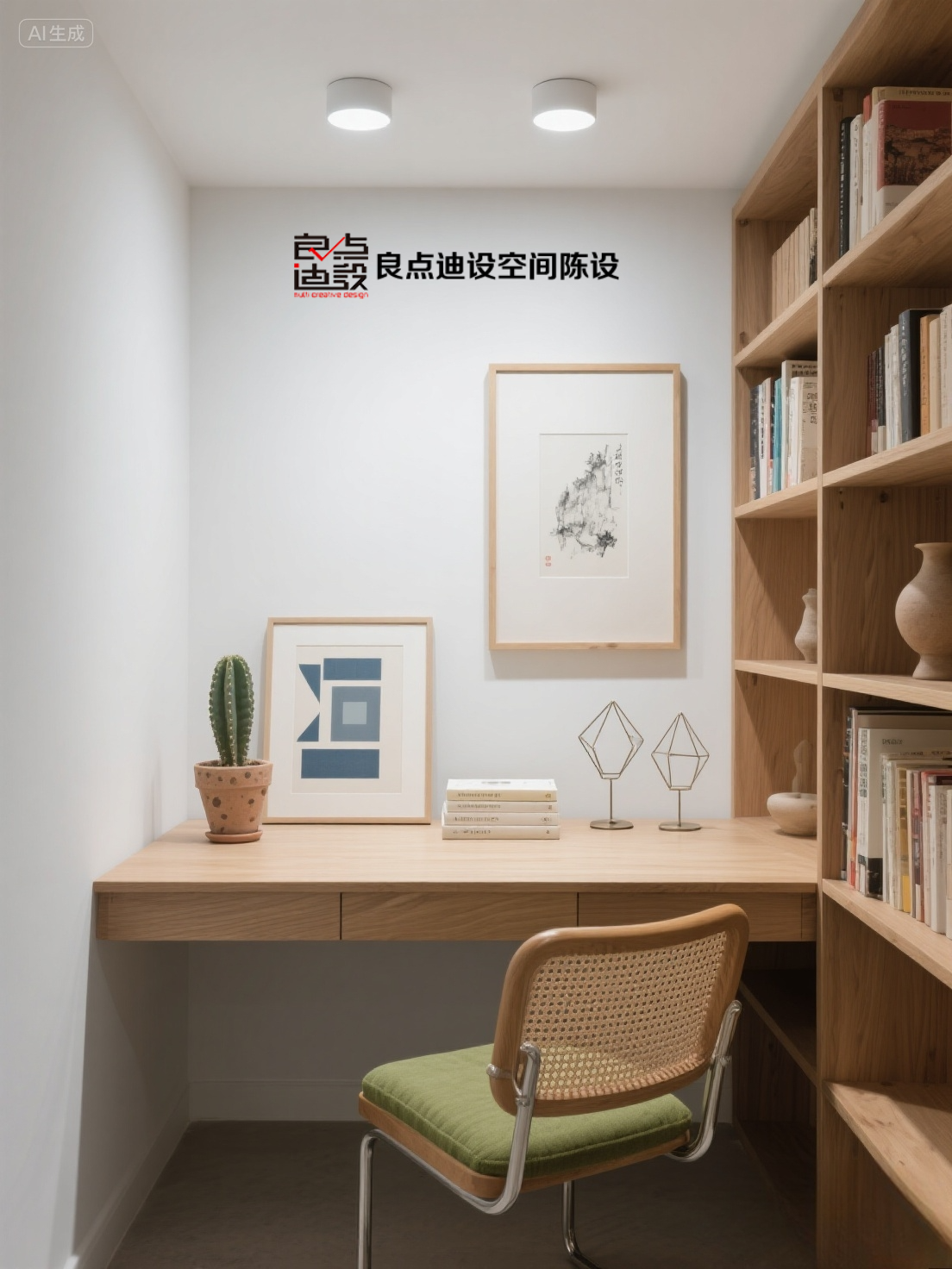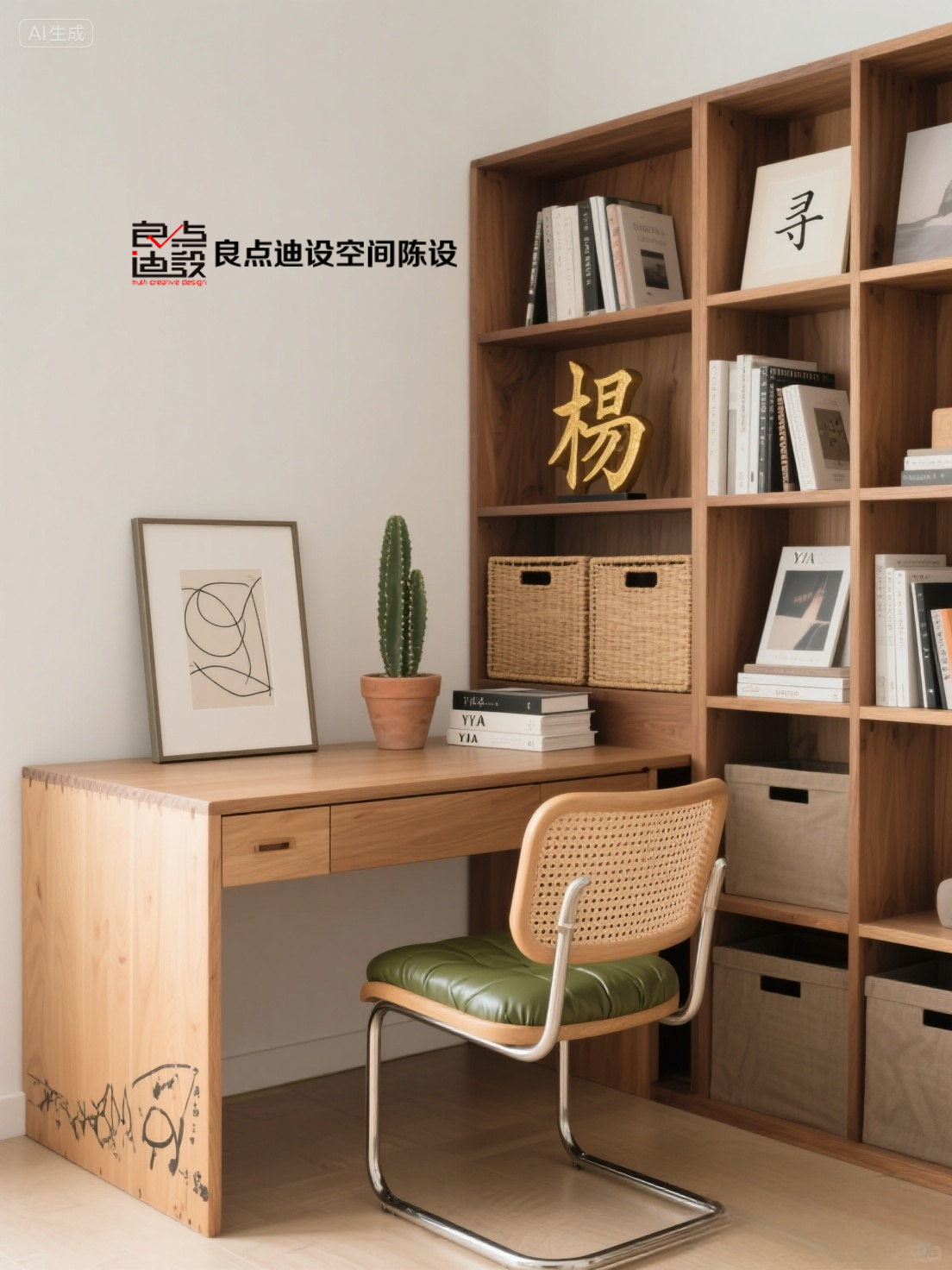 核心区整一套同色系木质书桌+内置书架,稳稳的温馨感就立住了!开放式书架别塞太满,书籍+小摆件错落有致,呼吸感拿捏。搭配一把复古调调办公椅,实用和颜值?我全都要!